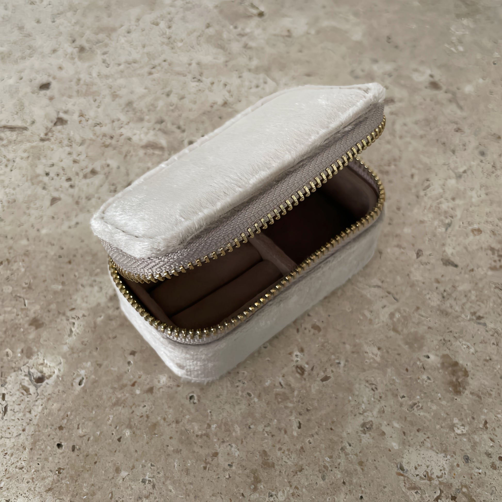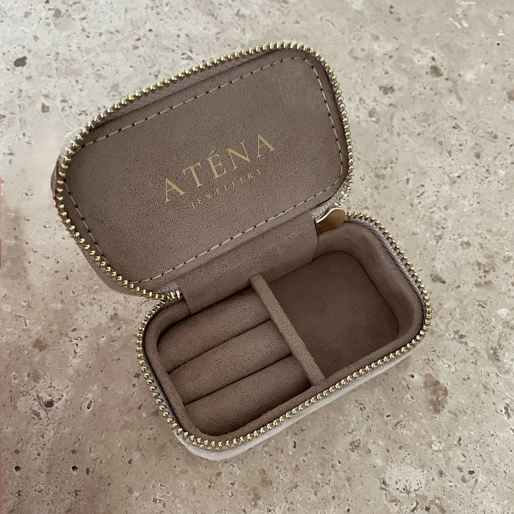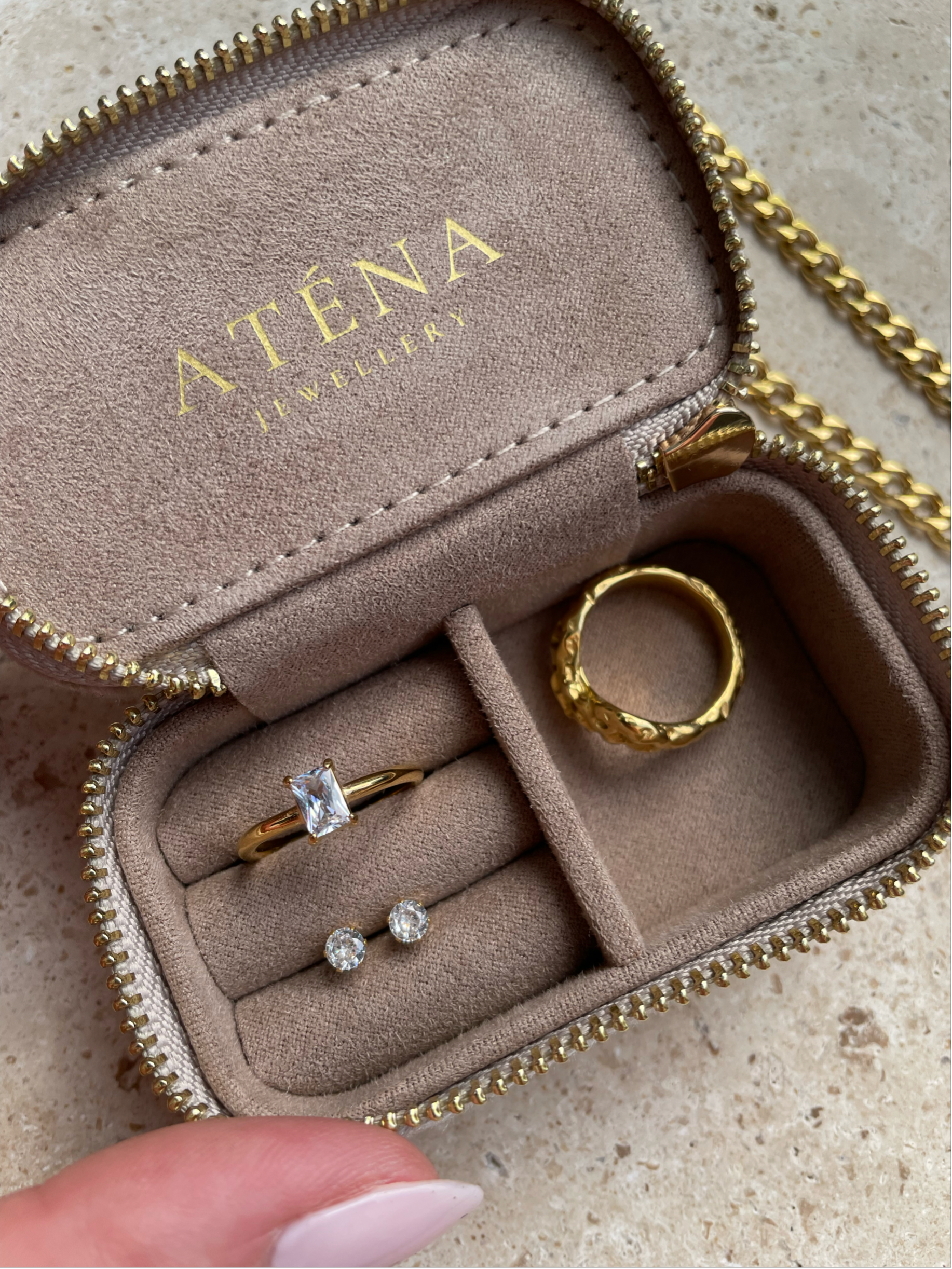 Æsken lukkes med guld lynlås og består af en ringsektion og en åben sektion, hvor du kan opbevare og beskytte dine smykker.